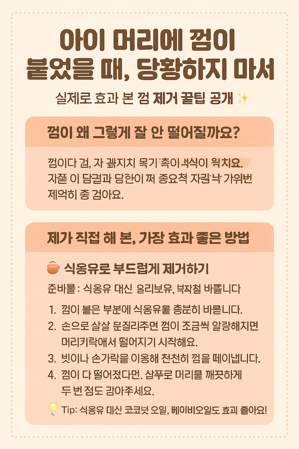 껌은 열에 약하지만 끈적임은 강해서, 머리카락처럼 얇고 긴 곳에 붙으면 떼어내기가 쉽지 않아요. 무턱대고 당기면 머리카락이 끊어지거나 아이가 아파할 수 있기 때문에 차분하고 부드러운 방식이 중요해요.